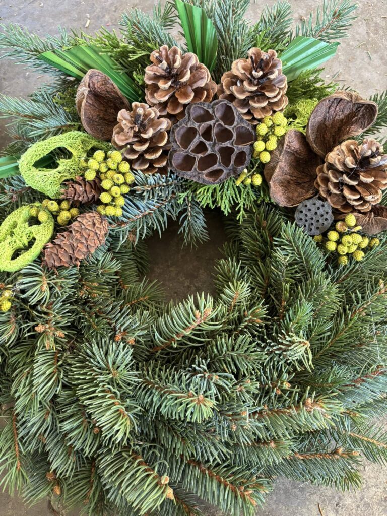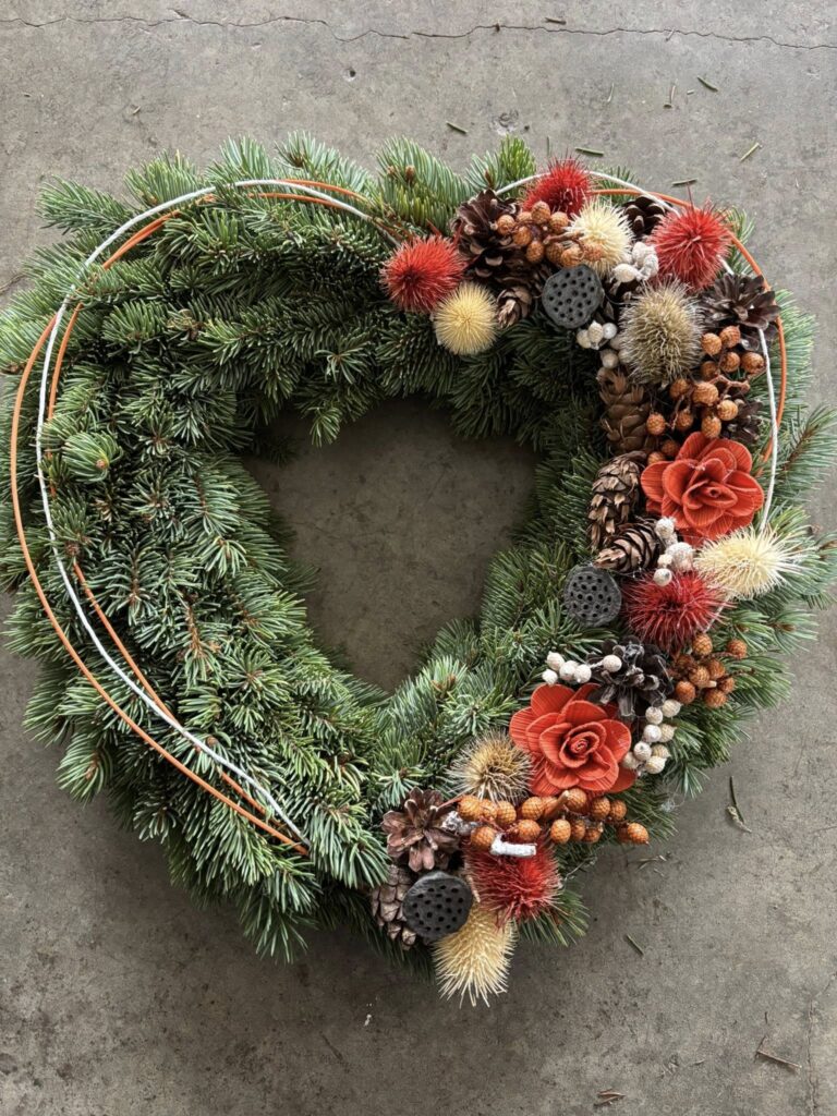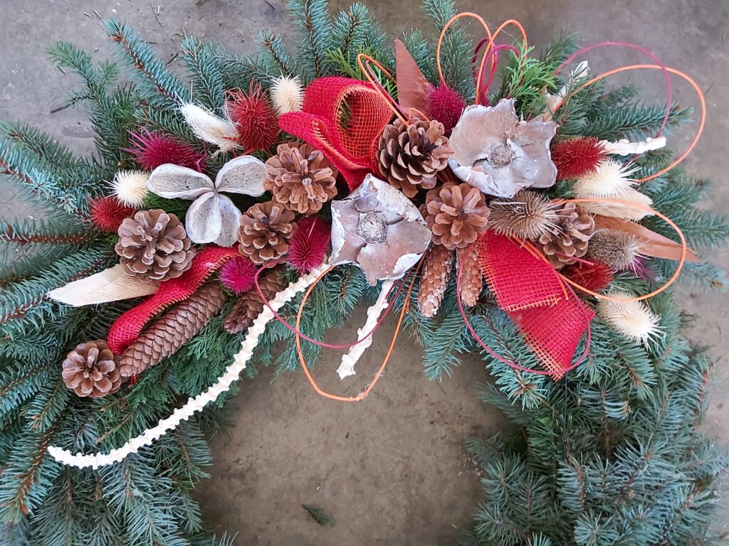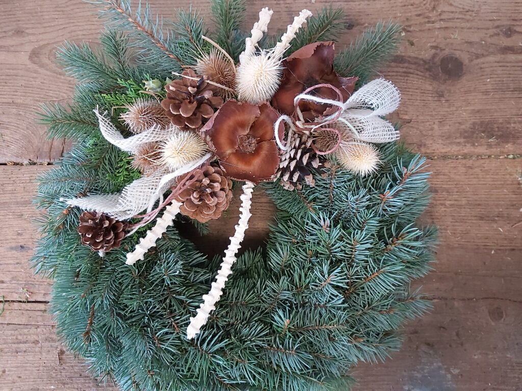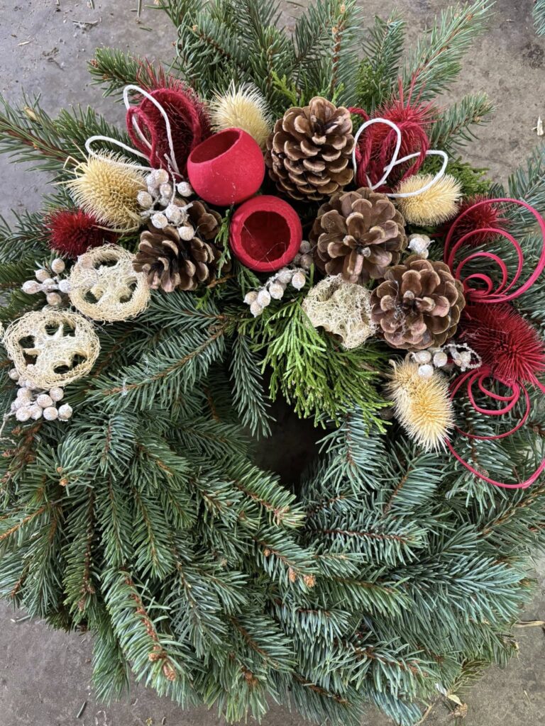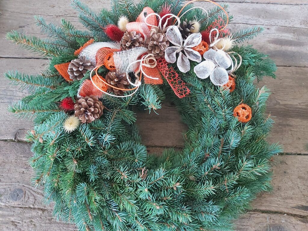 V nabídce máme věnce průměrů 30, 40, 50 a 60 cm, materiálem je stříbrný smrk nebo jedle vznešená (abies nobilis). Možnost zdobení s hlavou nebo po obvodu věnce, klasickými zdejšími materiály (šišky, bodláky, statice tatarika, achillea apod.) nebo s exotickými plody a přízdobami. Vždy bohatě zdobeno přírodními materiály, lze připravit v různém barevném provedení: do bíla, žluta, oranžova, červené barvy, do zelena. Lze i vzájemné kombinace barev, možno doplnit stuhou nebo trikolorou. Dle dohody můžeme připravit i vypichovaný věnec s povoskovanými květy (chryzantémy) nebo lesní.