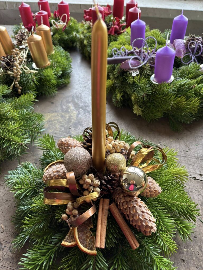 Dále připravujeme voňavé chvojové kytičky (jablko, pomeranč, skořice, badyán atd.), menší svícny, větší svícny hřbitovní, závěsné věnce na dveře a další. Postupně sortiment doplňujeme a rozšiřujeme.