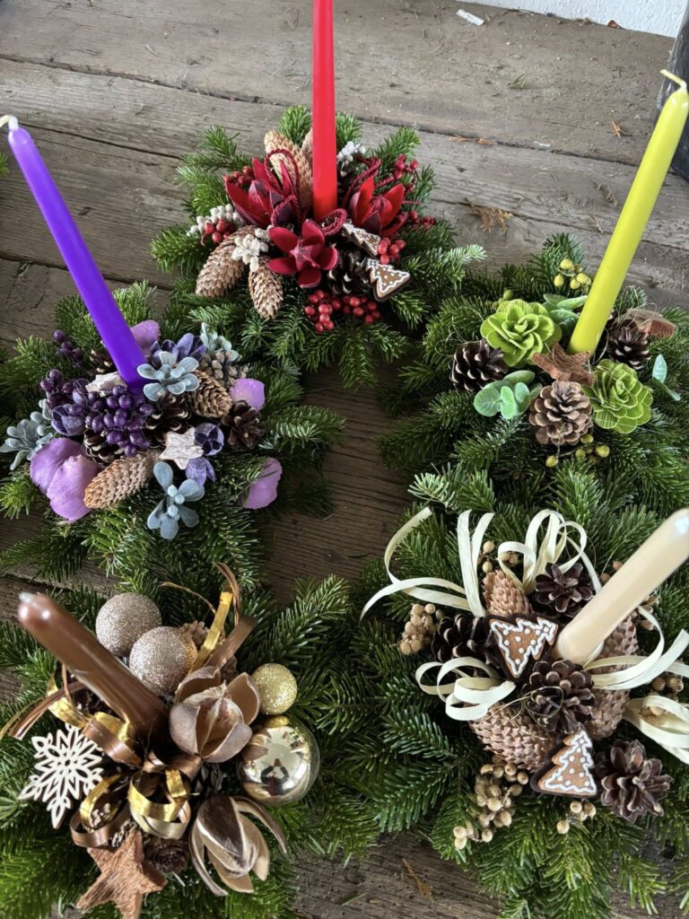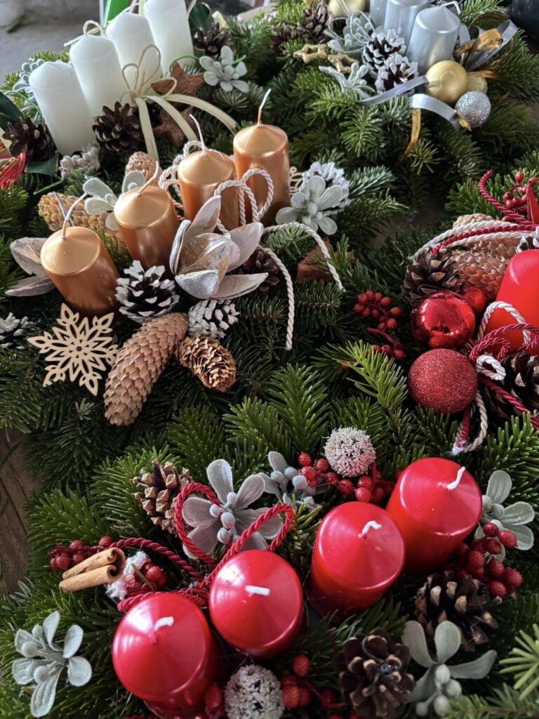 Kdo naopak rád již hotové adventní věnečky i se svíčkami, může si také u nás vybrat – na chvojovém základu kruhu 15 cm nebo 25 cm, také máme i svícny se svíčkami v řadě (in-line), v různých barvách.