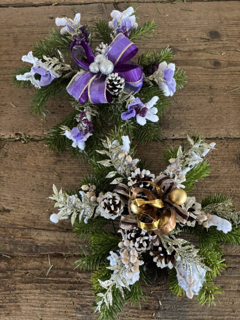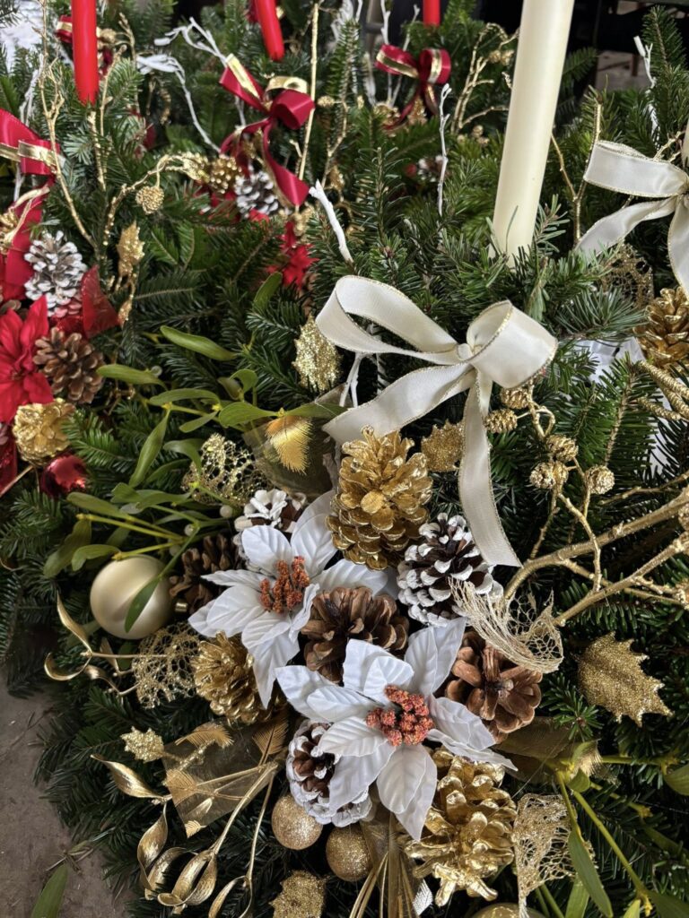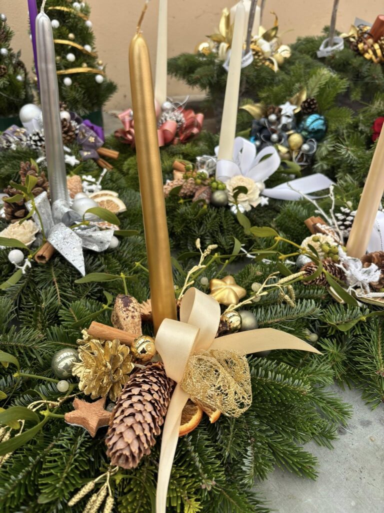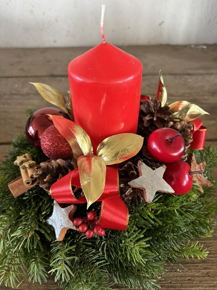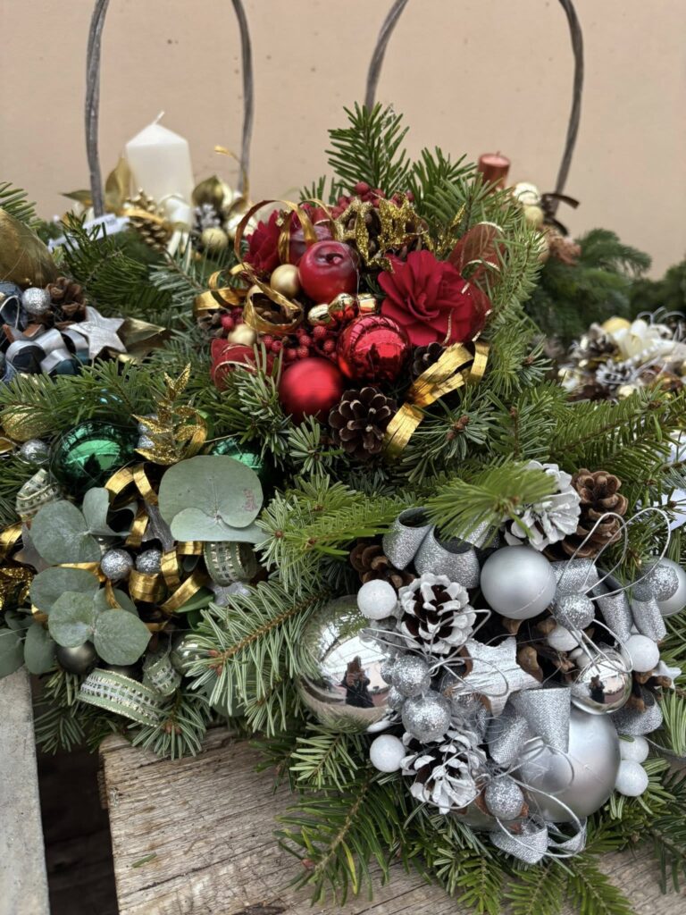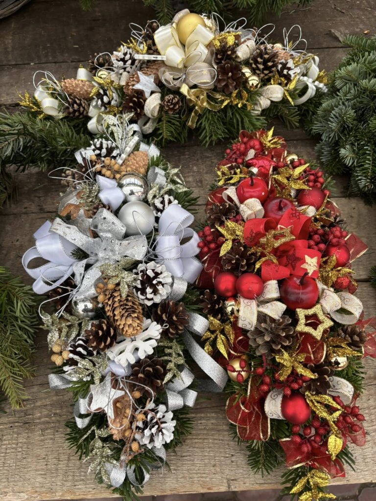 Voňavé chvojové kytičky (jablko, pomeranč, skořice, badyán atd.), „vánočky“ k zavěšení a položení, chvojové kytice různých barev, stromečky, košíky a jiné.