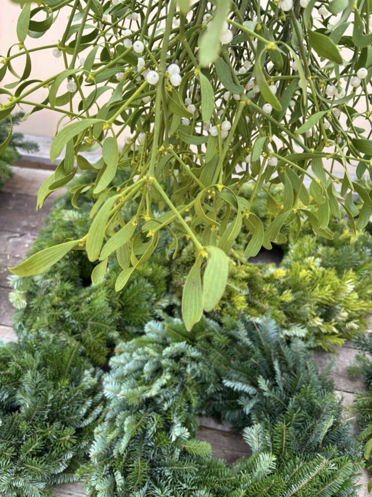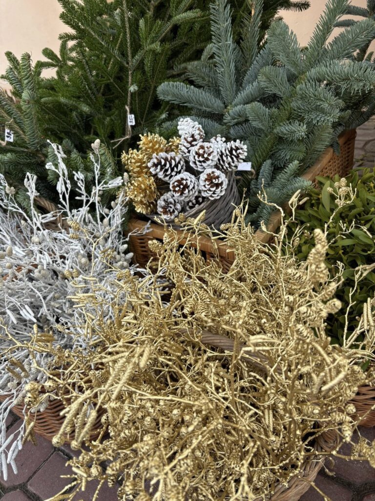 Dále bělené a zlacené svazky olše, přírodní zelené a zlacené jmelí. Máme i velké trsy (kotrče) zeleného jmelí k dekoraci. K vyrábění můžete zakoupit bělené a zlacené borové šišky.