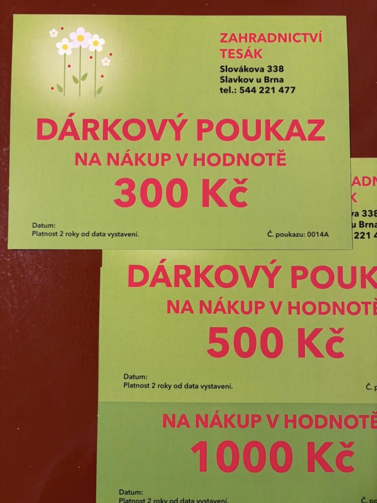 Tip na vánoční dárek – dárkový poukaz na nákup u nás, v hodnotě 300,-; 500,- nebo 1000,- Kč, platnost je 2 roky od data vystavení. Obdarovaný může zakoupit třeba hned na jaře spoustu různých květin, sazenice oblíbené zeleniny, jahod nebo třeba ovocné stromky… a hromadu dalších „věcí“.